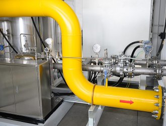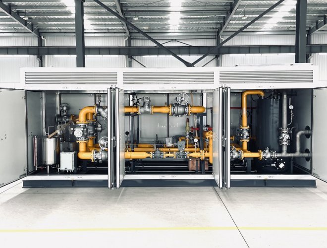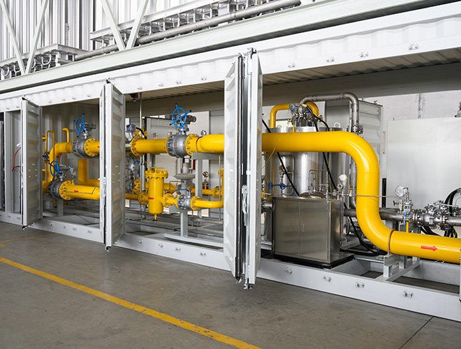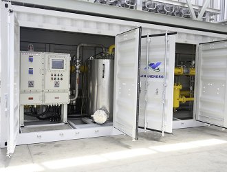調(diào)壓計量撬是經(jīng)過主氣化器氣化后的氣體,由于等壓氣化壓力基本保持和儲罐壓力相近,一般用戶需求壓力是一個恒定的范圍內(nèi)的值,需要進(jìn)行調(diào)壓穩(wěn)壓。同時為了計量核算費用或廠內(nèi)核算成本,對氣化后的LNG流量進(jìn)行計量,為了實現(xiàn)以上的功能組合在一起的裝置叫調(diào)壓計量撬。由矩形撬塊、調(diào)節(jié)匯管、控制閥、計量管、流量計、調(diào)節(jié)閥、調(diào)節(jié)管、過濾器、出氣管、進(jìn)氣匯管、進(jìn)氣口、出氣匯管、排污管和安全放氣閥組成。有的裝置內(nèi)需要加入加臭系統(tǒng)。